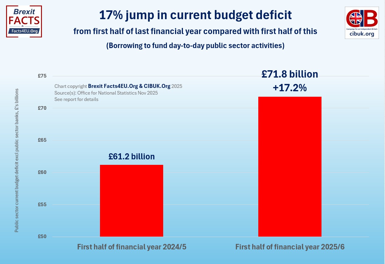Below we show he incredibly rapid 17% increase in the deficit under Chancellor Reeves from the first six months of the last financial year to the first six months of this one.