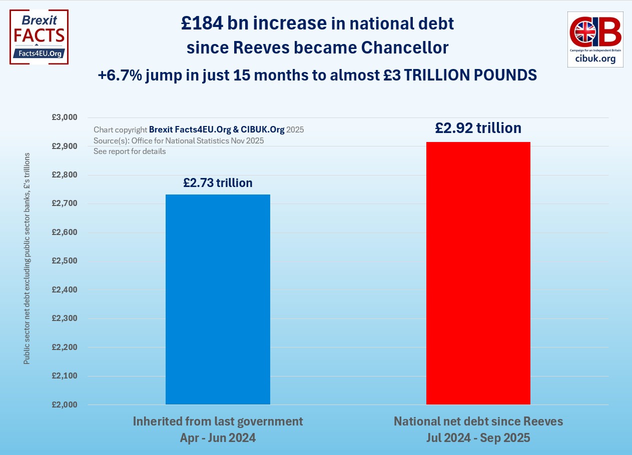 We ask the difficult questions. With debts rocketing and no signs of public expenditure being reduced or even controlled, where is the action ahead of the Chancellor taking yet more money off us in her Budget next week? It is worth holding one figure in your mind: our overall national debt now stands at nearly £3 trillion pounds. First, though, we summarise the state of Ms Reeves’ ‘overdraft’.