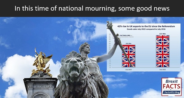 The latest trade figures released by the Office for National Statistics (ONS) yesterday demolish Project Fear’s claims that UK exports would ‘fall off a cliff’. UK exports to the EU continue to climb, with a 42.3% increase when comparing July 2022 with July 2016 (just after the EU Referendum).