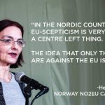 It lasts just over an hour and can be watched here. It features archive footage of the late Tony Benn and more recent interviews with Kate Hoey and George Galloway. It highlights the long-standing tradition of left-of-centre withdrawalism and mentions that some trade unions, including the Bakers’ Union and the RMT, support Brexit. Helle Hagenau (pictured above), a long-standing friend of CIB, points out that in Nordic countries, EU-scepticism is very much a centre-left phenomenon.
