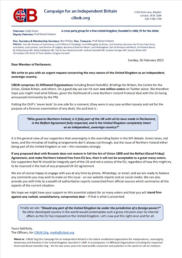 CIBUK comprises 15 Affiliated Organisations including Brexit Facts4EU, Briefings for Britain, the Centre for the Union, Global Britain, and others. On a good day we can hit over one million voters on Twitter alone. We therefore hope you might read what follows, given the likelihood of a new Northern Ireland Protocol deal with the EU being announced imminently by the PM.