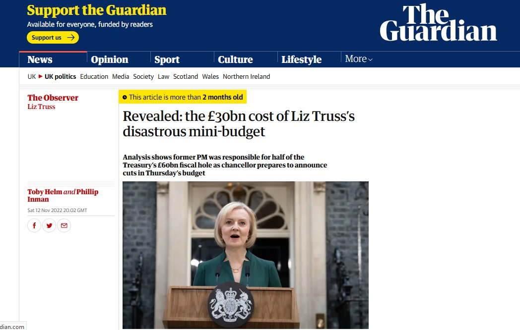 This one appears to be based on a report in the Observer (12th November) which claimed that ‘Liz Truss’s disastrous mini-budget cost the country a staggering £30 billion’.