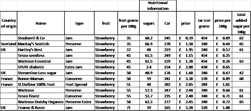 The other important consumer choice issue determined by the amount of fruit in jam, is of course price. The jams with less fruit and more sugar are generally cheaper per 100 grams. The price difference between the cheapest and most expensive jams was over 10x in my short survey of strawberry jams sold in only two UK supermarkets (see chart above). This is not an insignificant difference.